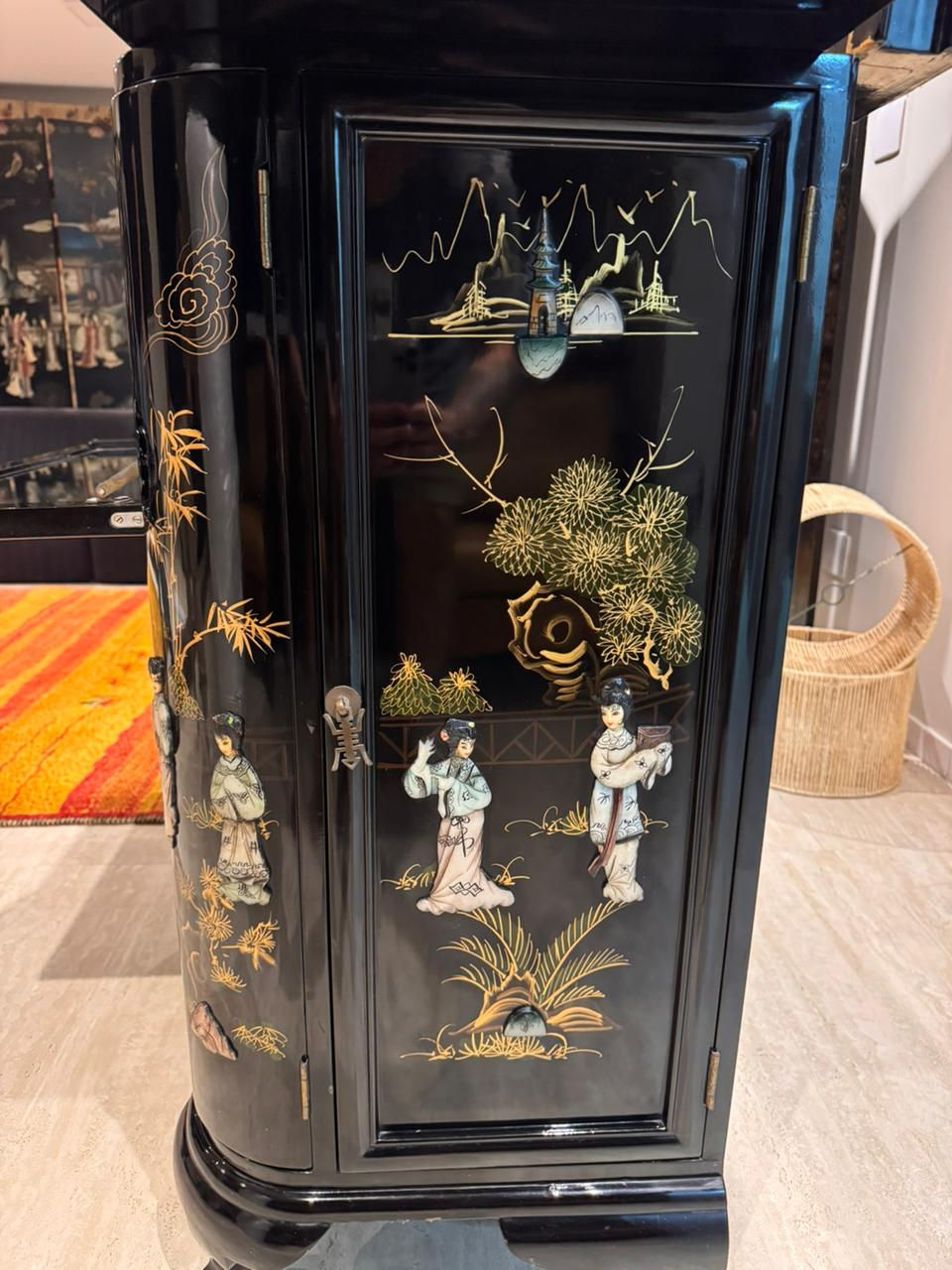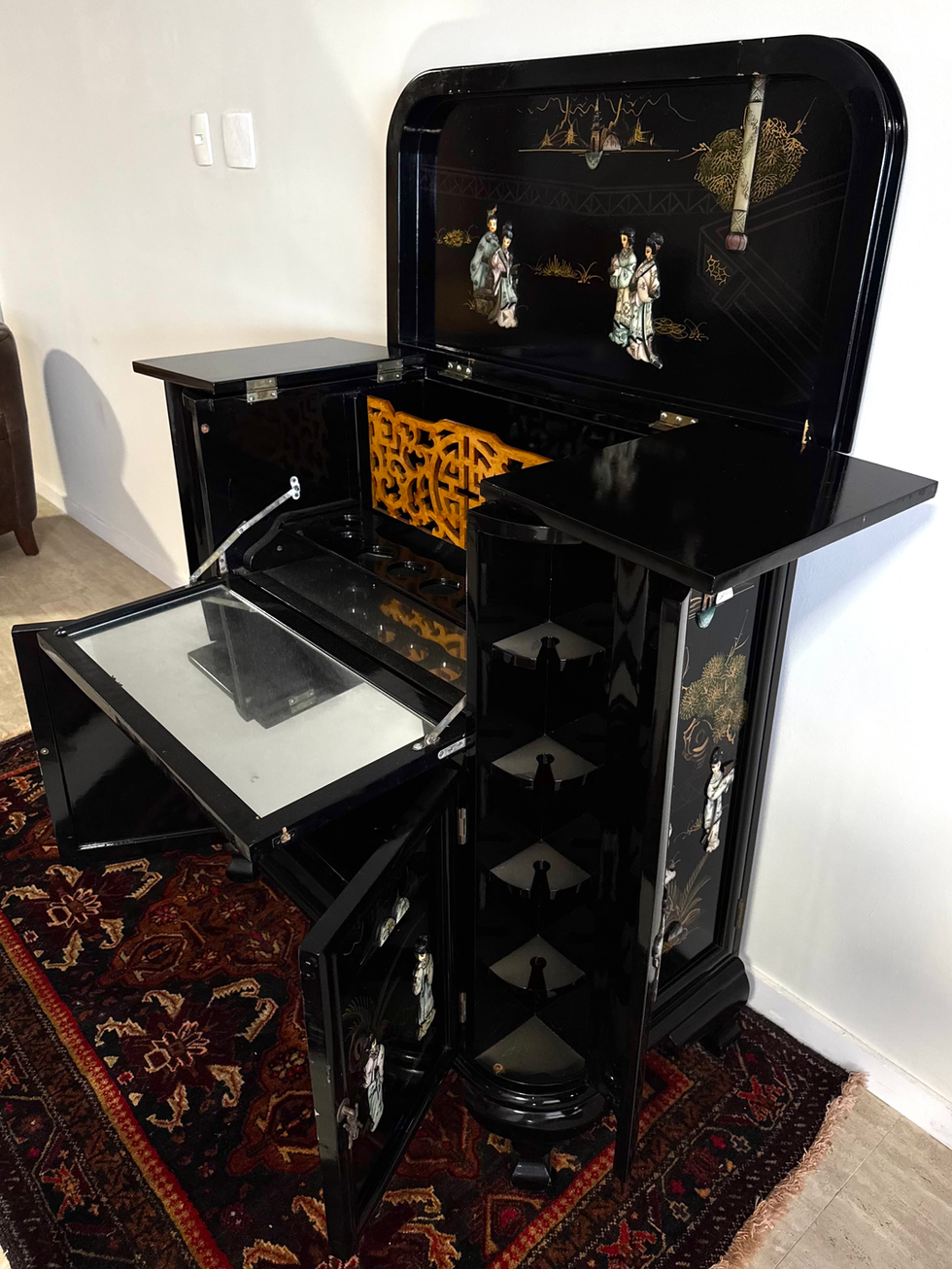 Bar Chinês Antigo Lacado preto, pinturas orientais douradas, aplicações tridimensionais de figuras chinesas, estrutura em madeira curva, quatro portas, tampo articulado tipo bar, e acabamento artístico típico das peças dos anos 1940–1970