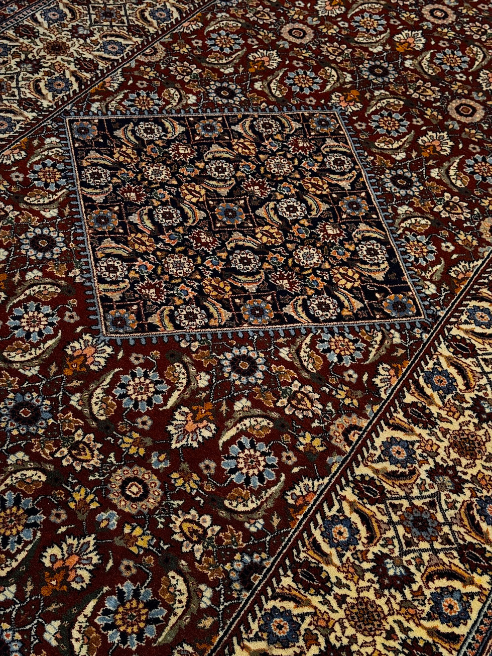 Feito em lã fina com possíveis detalhes em seda, esse tapete oferece não apenas beleza, mas também durabilidade excepcional, tornando-o ideal tanto para uso quanto para decoração de destaque.