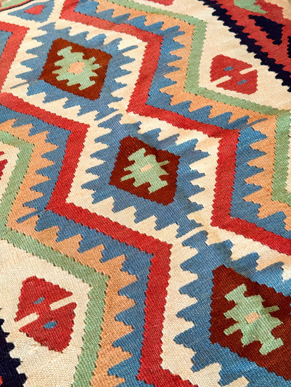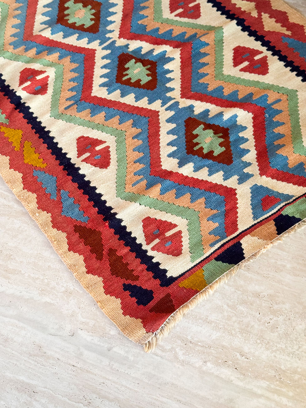 Este belíssimo Kilim indiano apresenta uma composição vibrante de padrões geométricos em tons de vermelho, azul, verde-água, bege e detalhes terrosos. O desenho em zigue-zague com formas centrais simétricas cria movimento, identidade e forte impacto visual.